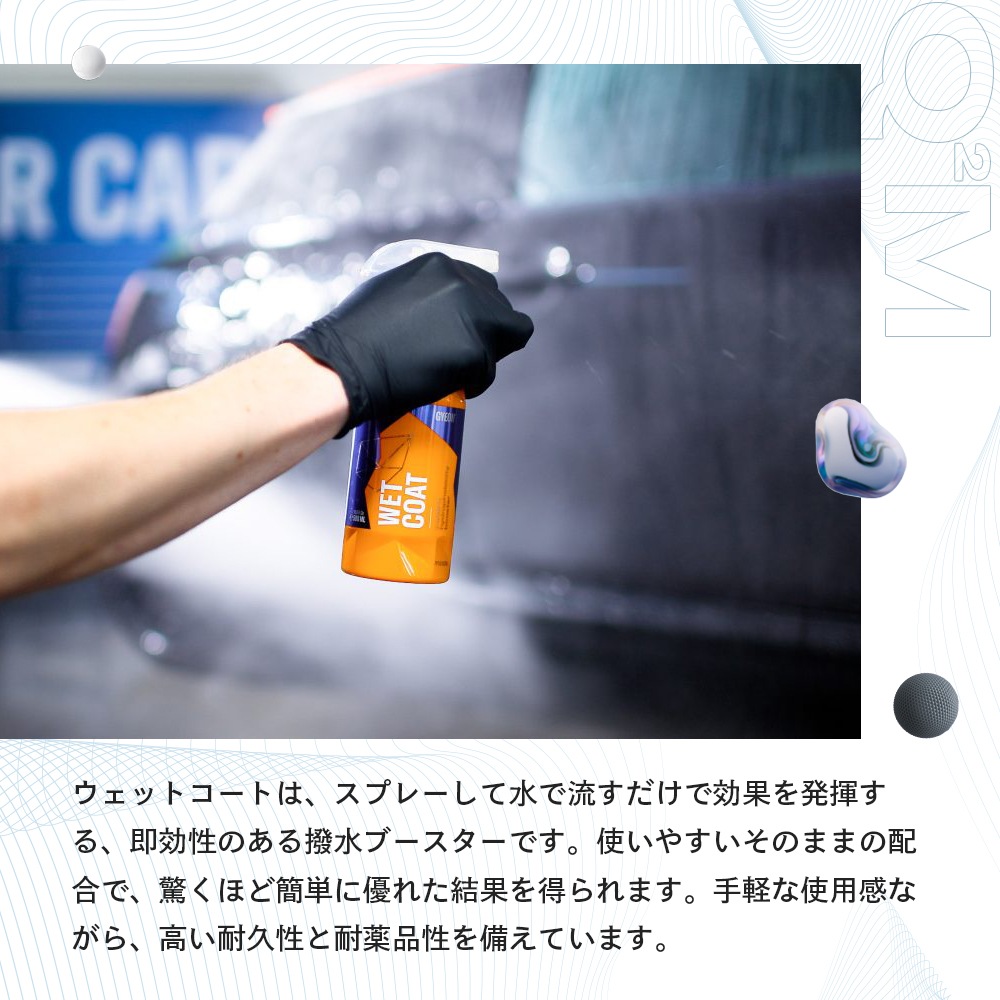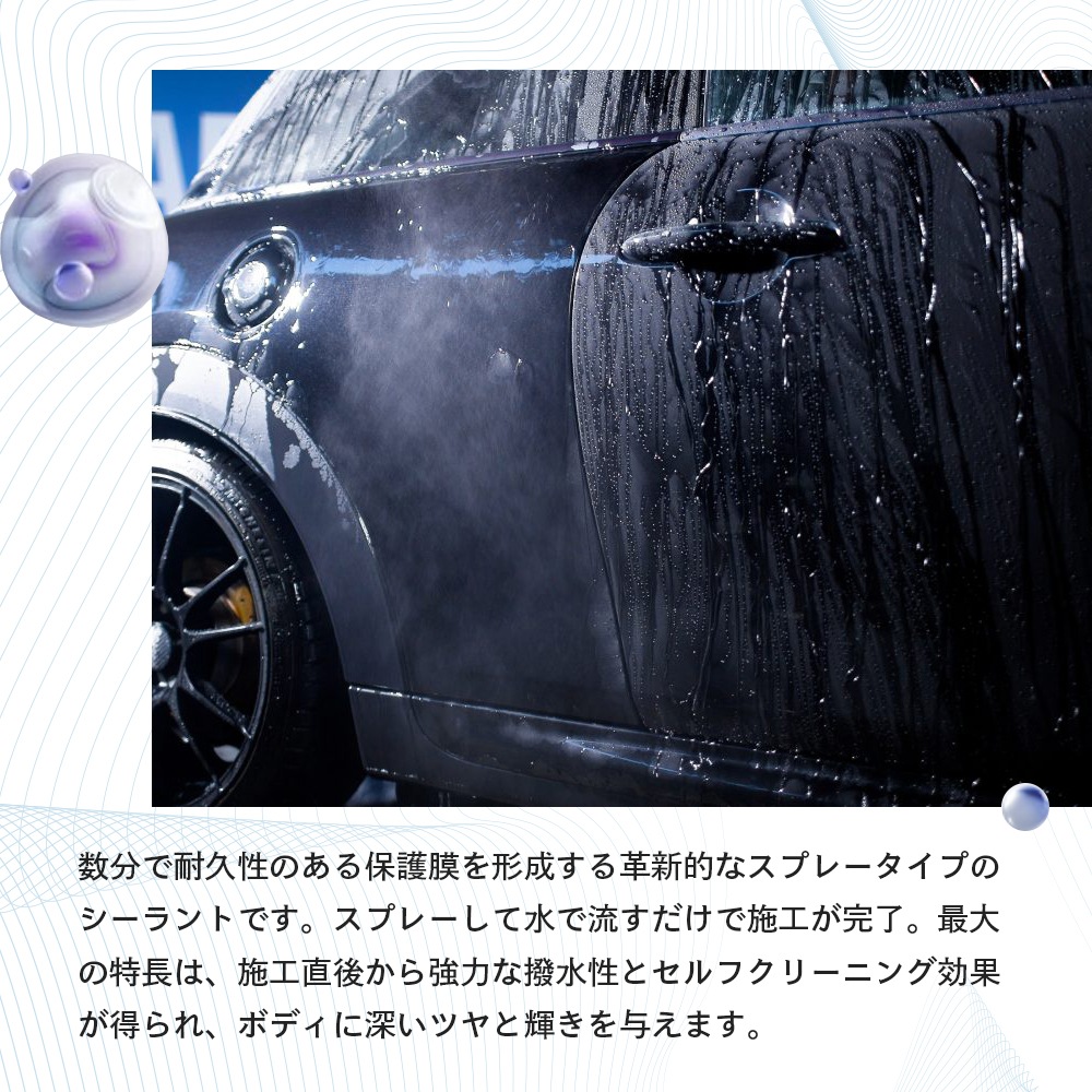 ●濡れたままのボディにスプレーして洗い流すだけの簡単作業でコーティングが可能な次世代型コーティング剤です。