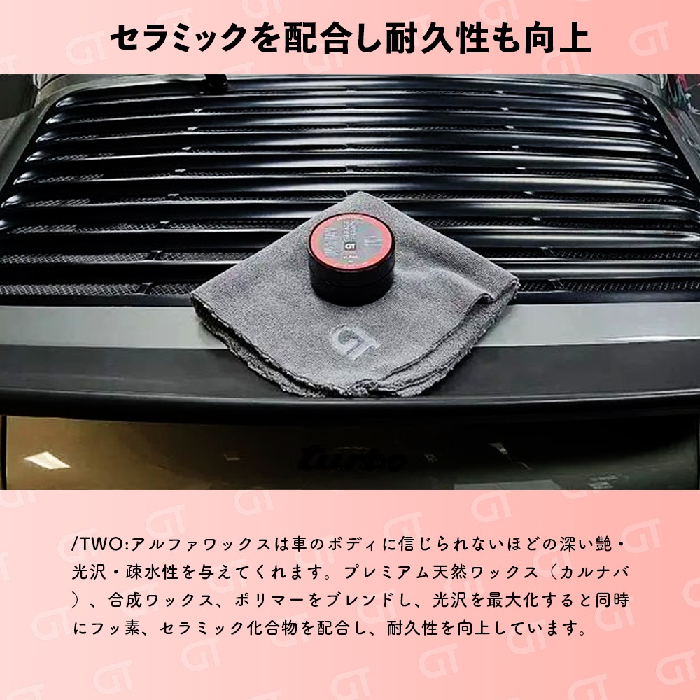 /TWO:アルファワックスは車のボディに信じられないほどの深い艶・光沢・疎水性を与えてくれます。プレミアム天然ワックス(カルナバ)、合成ワックス、ポリマーをブレンドし、光沢を最大化すると同時にフッ素、セラミック化合物を配合し、耐久性を向上しています。究極の耐久性・疎水性・光沢を実現する最高のカーワックスです。