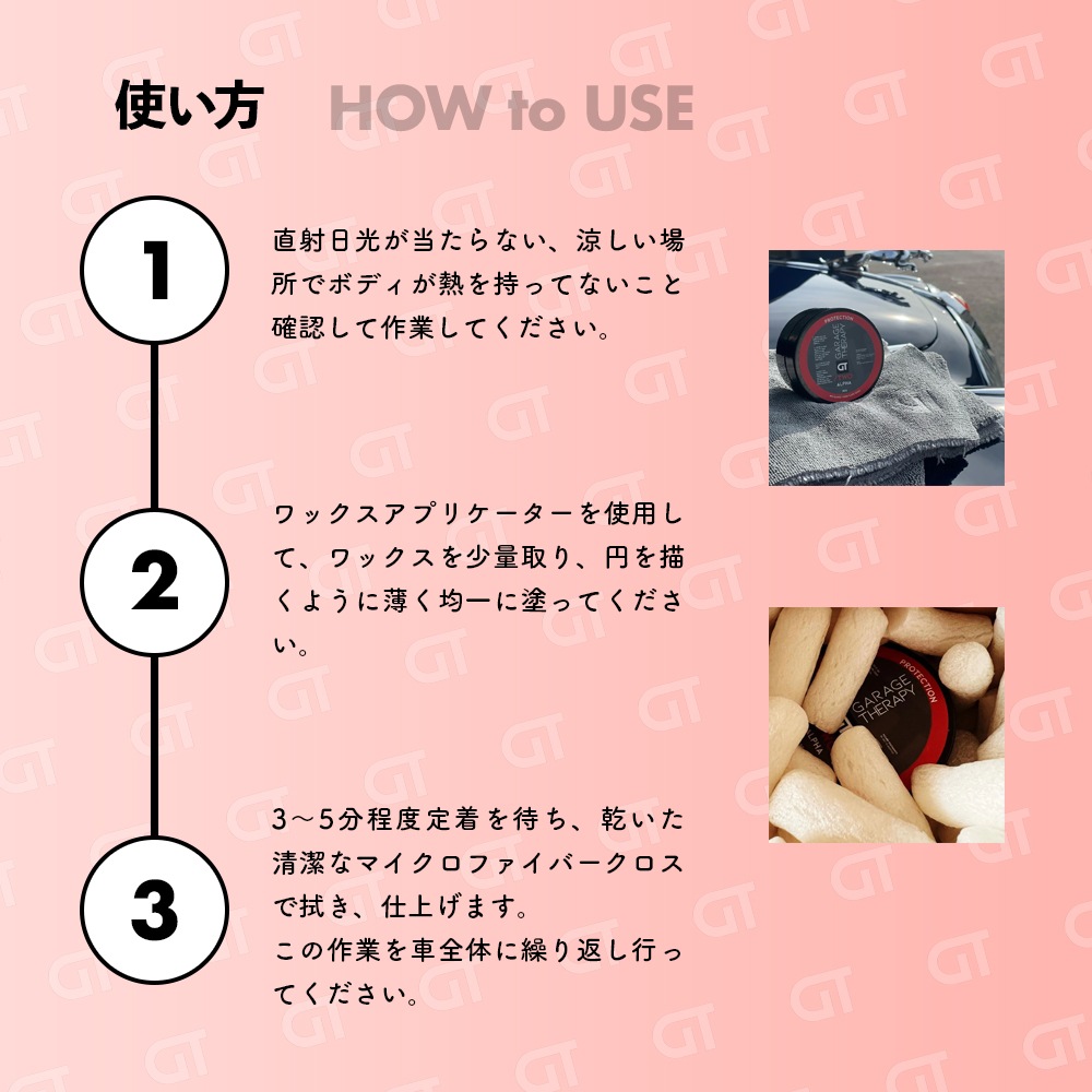 1)塗装表面の汚れはもちろん、鉄粉や古いワックス·油分を取り除き傷がある場合は磨きをかけて表面を整えてください。