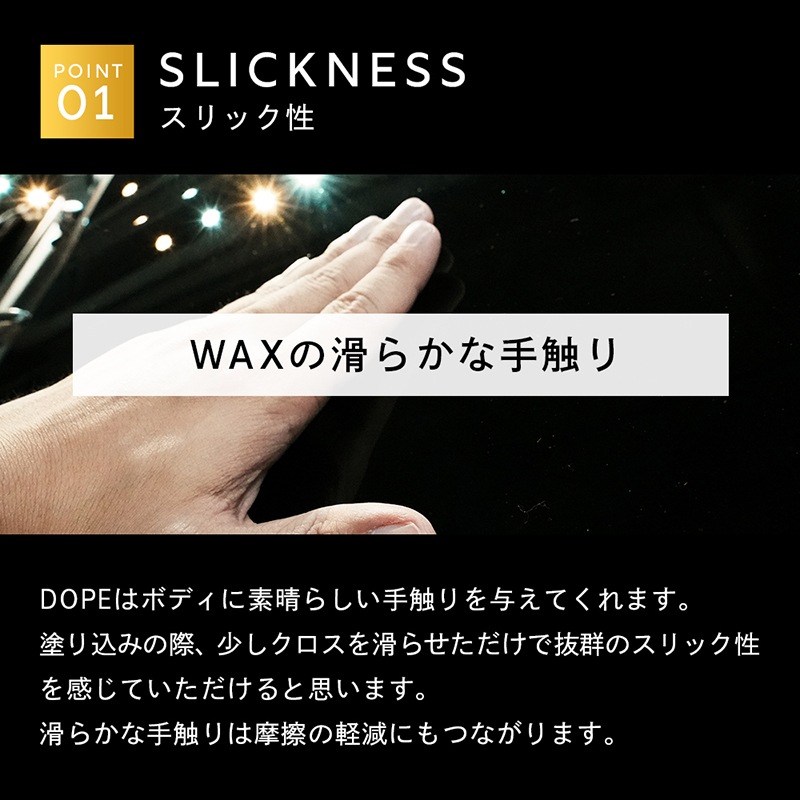 塗り込みの際、少しクロスを滑らせただけで抜群のスリック性を感じていただけると思います。