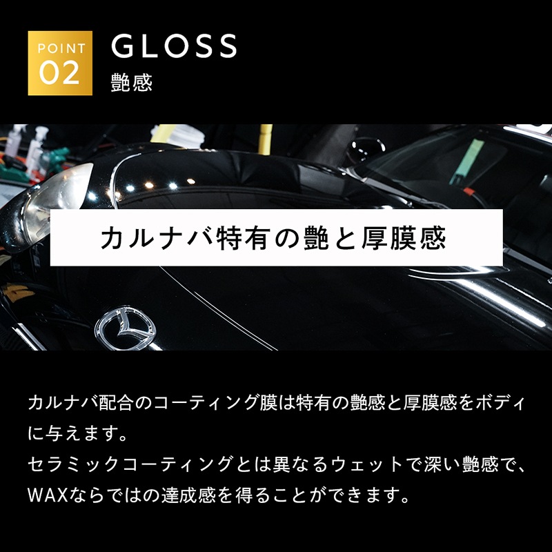 セラミックコーティングとは異なるウェットで深い艶感で、WAXならではの達成感を得ることができます。