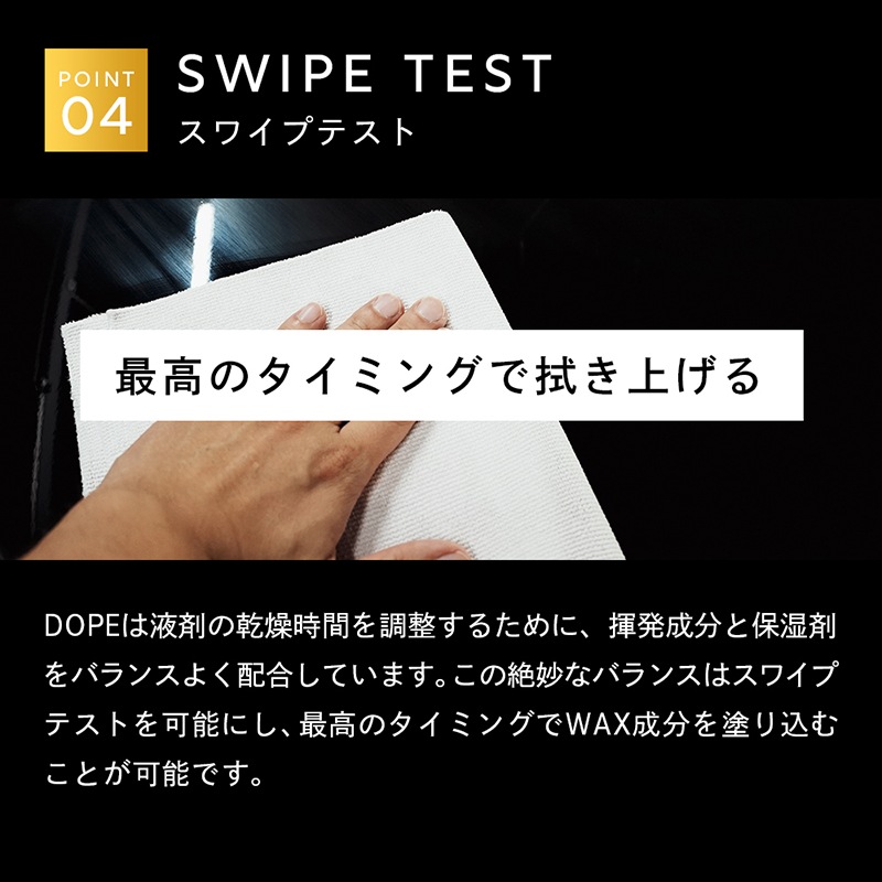 この絶妙なバランスはスワイプテストを可能にし、最高のタイミングでWAX成分を塗り込む ことが可能です。