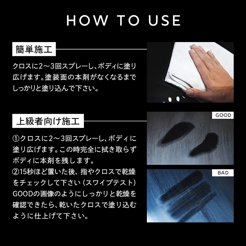 2:15秒ほど置いた後、指やクロスで乾燥をチェックして下さい(スワイプテスト)しっかりと乾燥を確認できたら、乾いたクロスで塗り込むように仕上げて下さい。