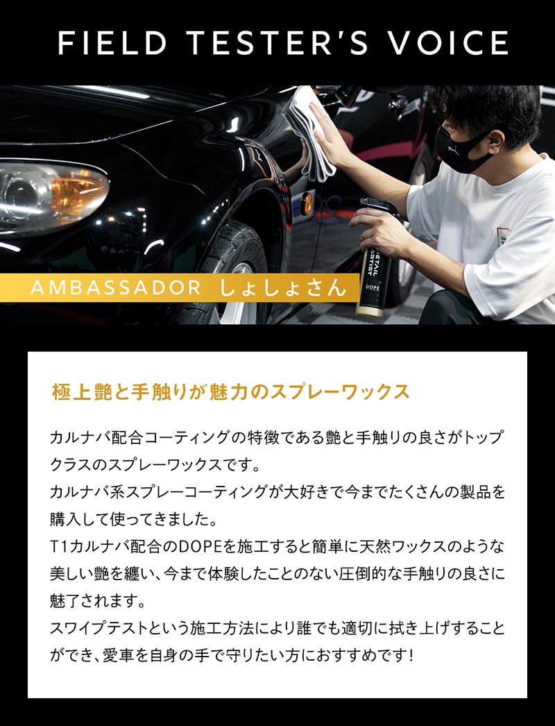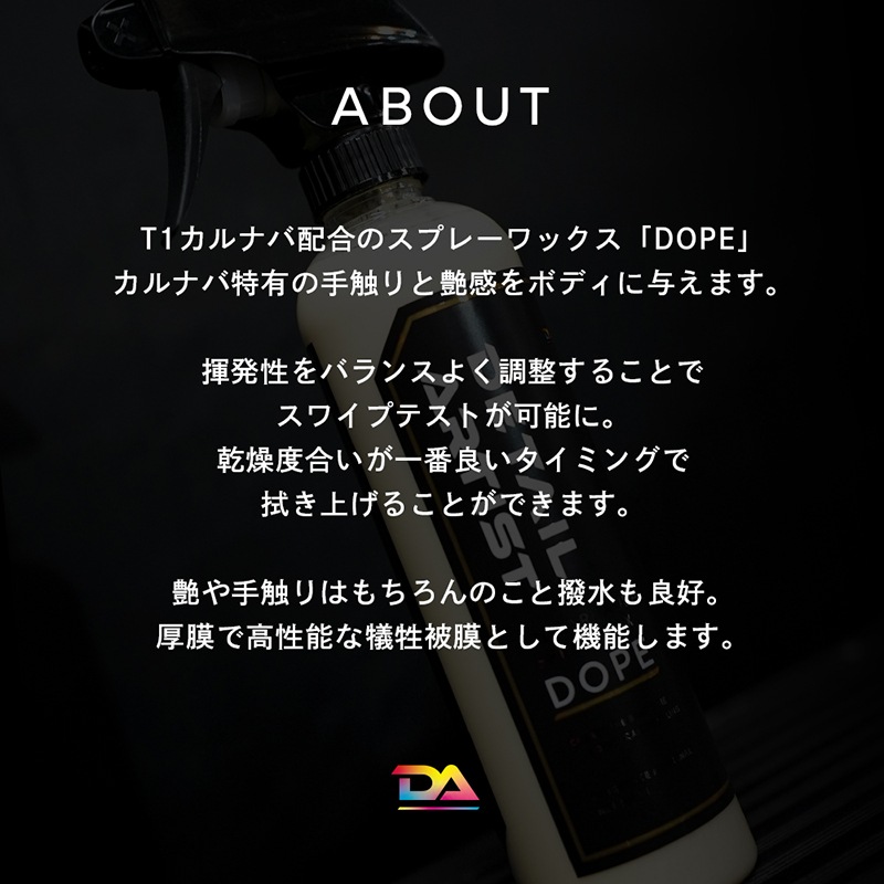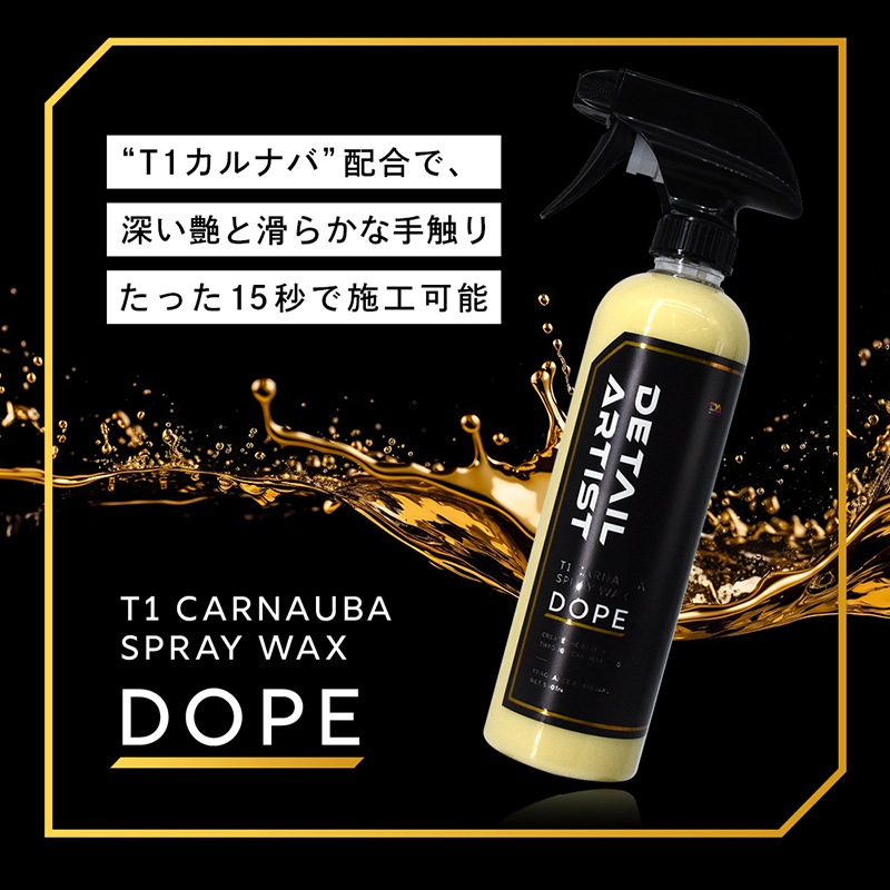 T1カルナバ配合のスプレーワックス「DOPE」カルナバ特有の手触りと艶感をボディに与えます。揮発性をバランスよく調整することでスワイプテストが可能に。乾燥度合いが一番良いタイミングで拭き上げることができます。艶や手触りはもちろんのこと撥水も良好。 厚膜で高性能な犠牲被膜として機能します。