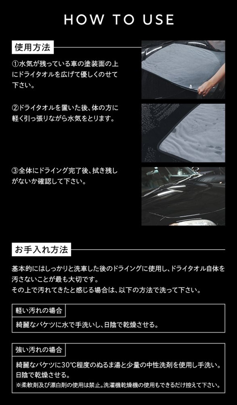 基本的にはしっかりと洗車した後のドライングに使用し、ドライタオル自体を汚さないことが最も大切です。