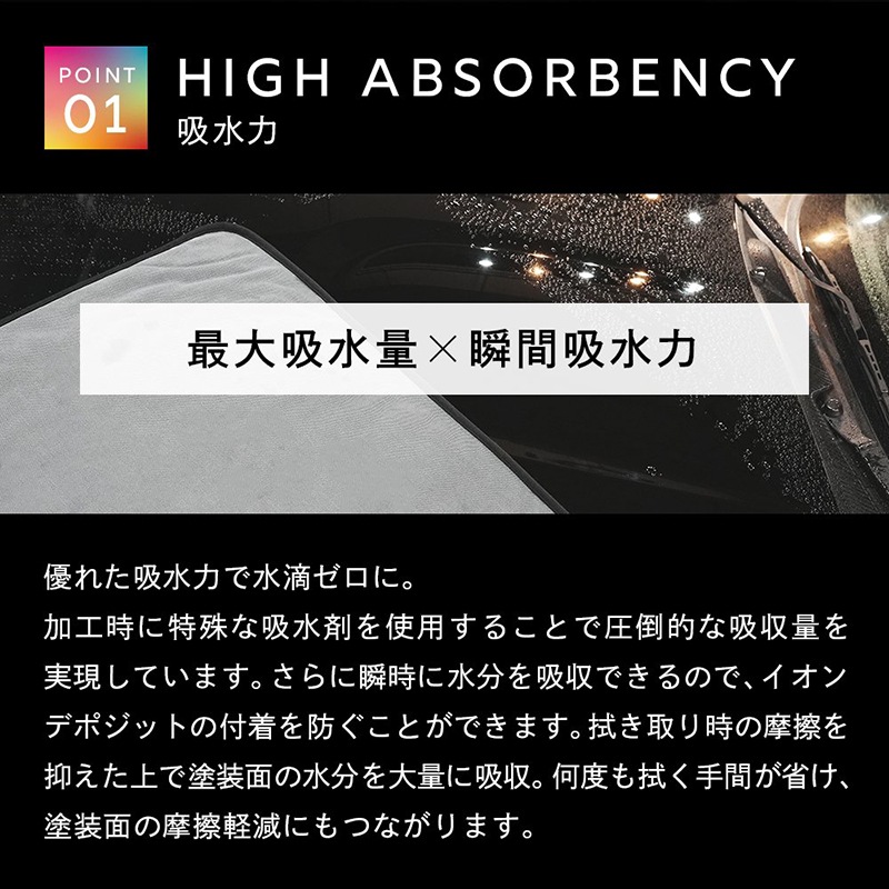 加工時に特殊な吸水剤を使用することで圧倒的な吸収量を実現しています。さらに瞬時に水分を吸収できるので、イオン デポジットの付着を防ぐことができます。拭き取り時の摩擦を抑えた上で塗装面の水分を大量に吸収。何度も拭く手間が省け、塗装面の摩擦軽減にもつながります。