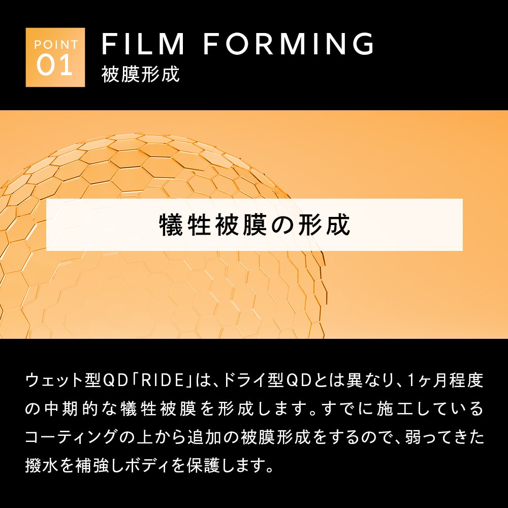 ウェット型QD「RIDE」は、ドライ型QDとは異なり、1ヶ月程度の中期的な犠牲被膜を形成します。すでに施工しているコーティングの上から追加の被膜形成をするので、弱ってきた撥水を補強しボディを保護します。