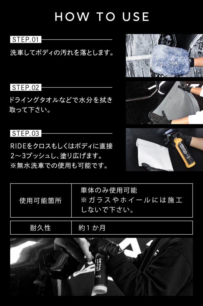 すでに施工したコーティングの撥水が弱まってきた時、「RIDE」の使用をお勧めします。「RIDE」はボディに追加の撥水を付与し、弱まってきた撥水性能を復活させてくれます。