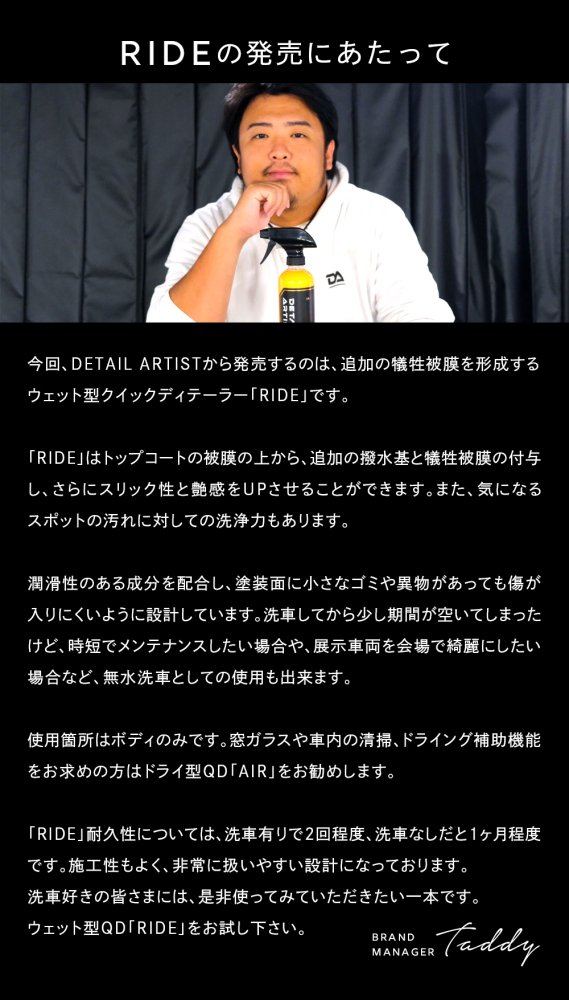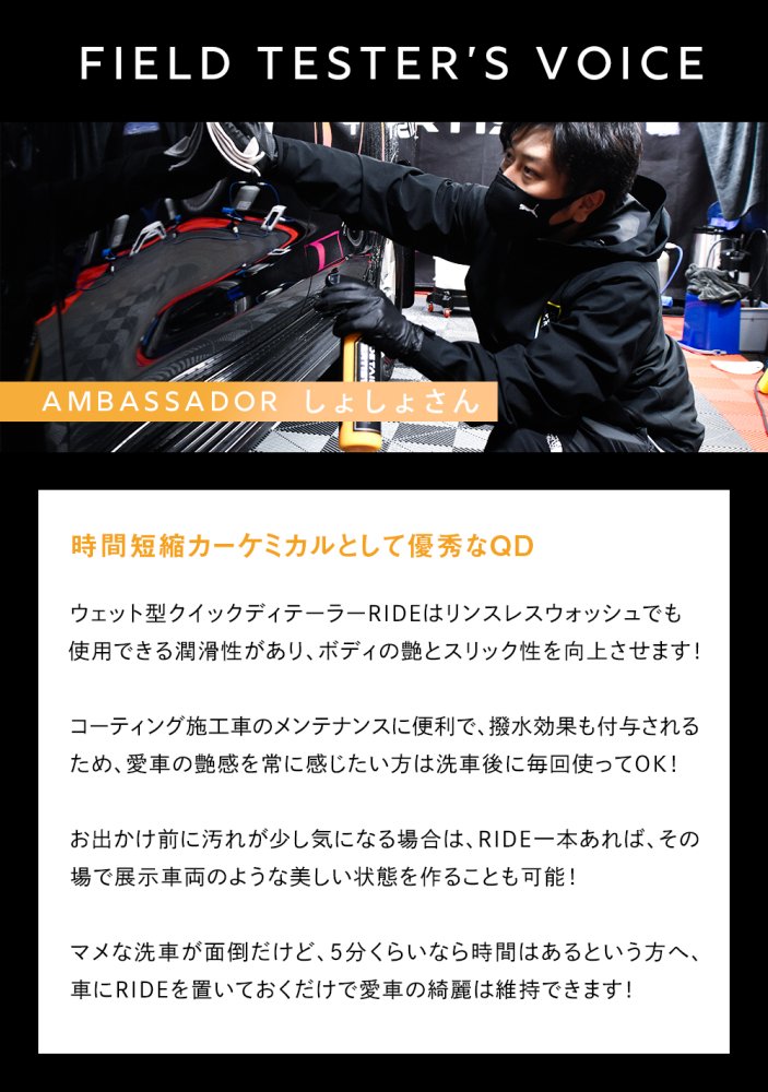 ウェット型QD「RIDE」は潤滑性があり、軽度のほこりや汚れがある状態でもキズになりにくく、無水洗車としての使用も可能です。