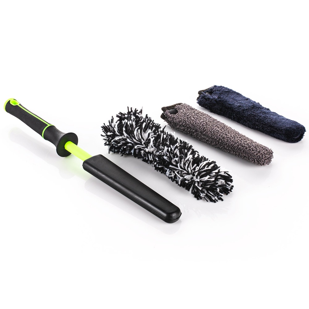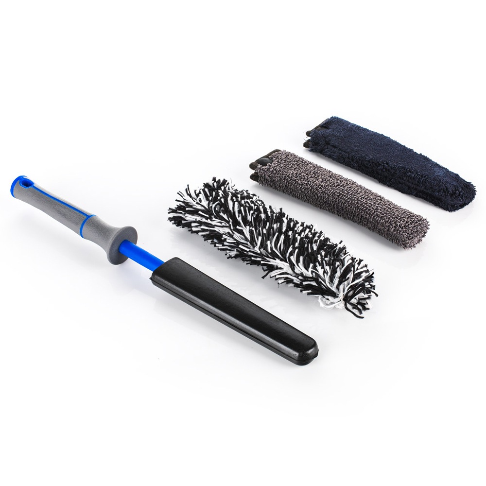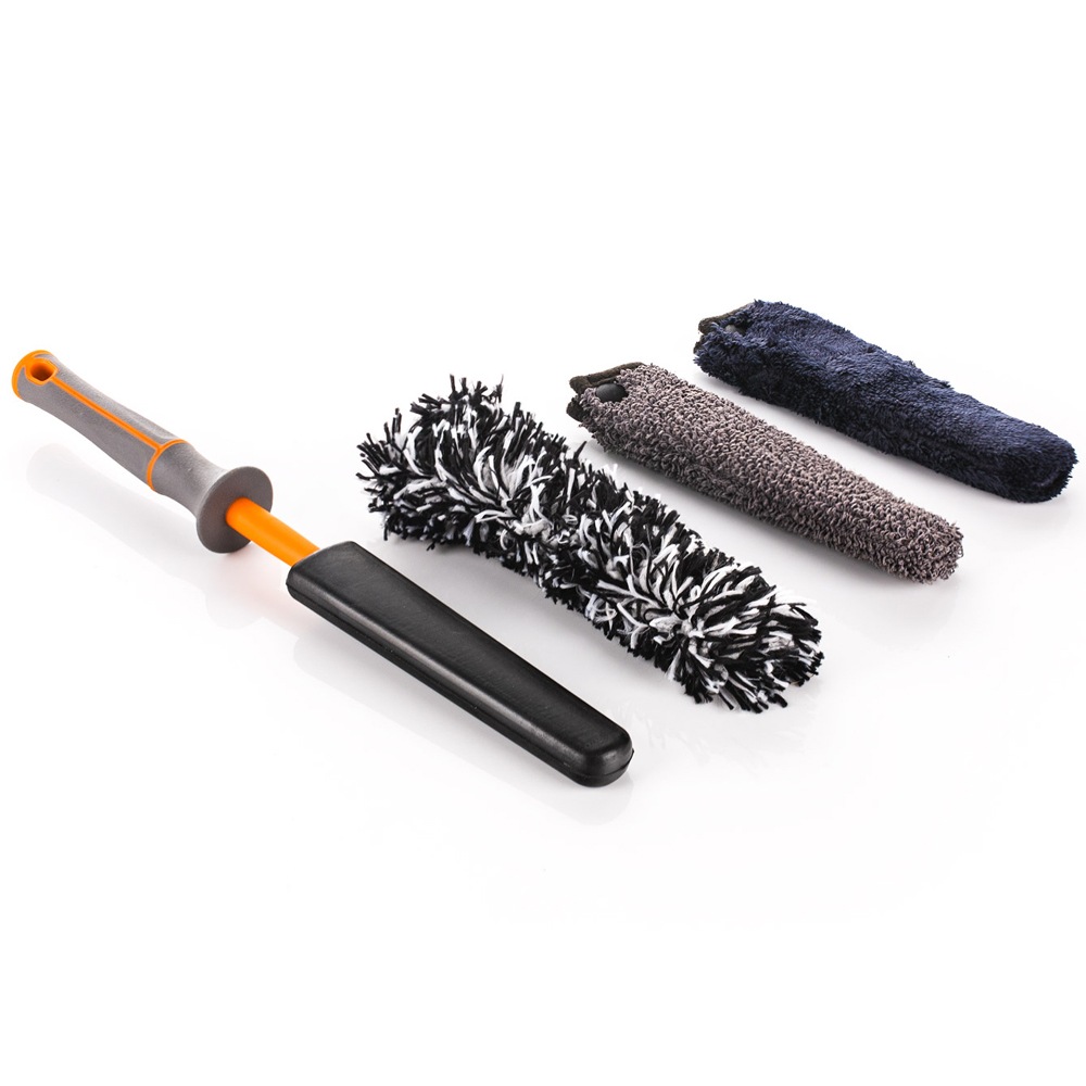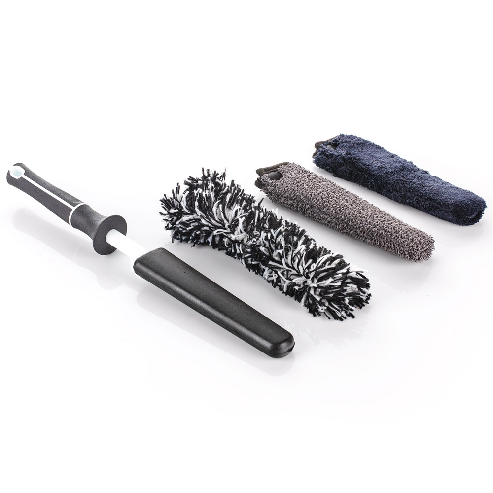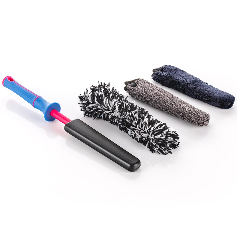 ●3種類のマイクロファイバークリーニングブラシカバーとグリップのセット。