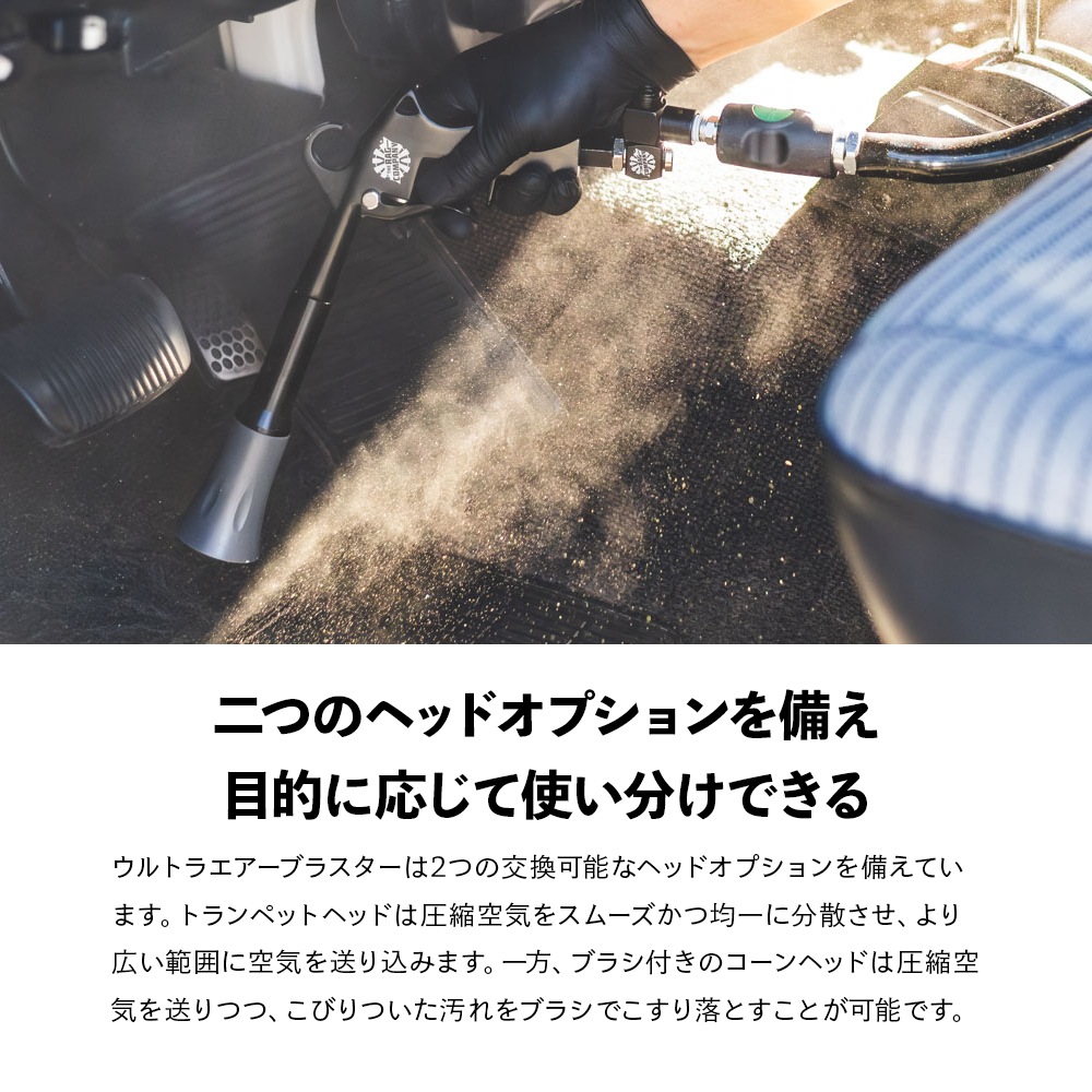 ウルトラエアブラスターはトリガー式で、2つの交換可能なヘッドオプションを備えています。交換は手で回してねじ込むだけです。